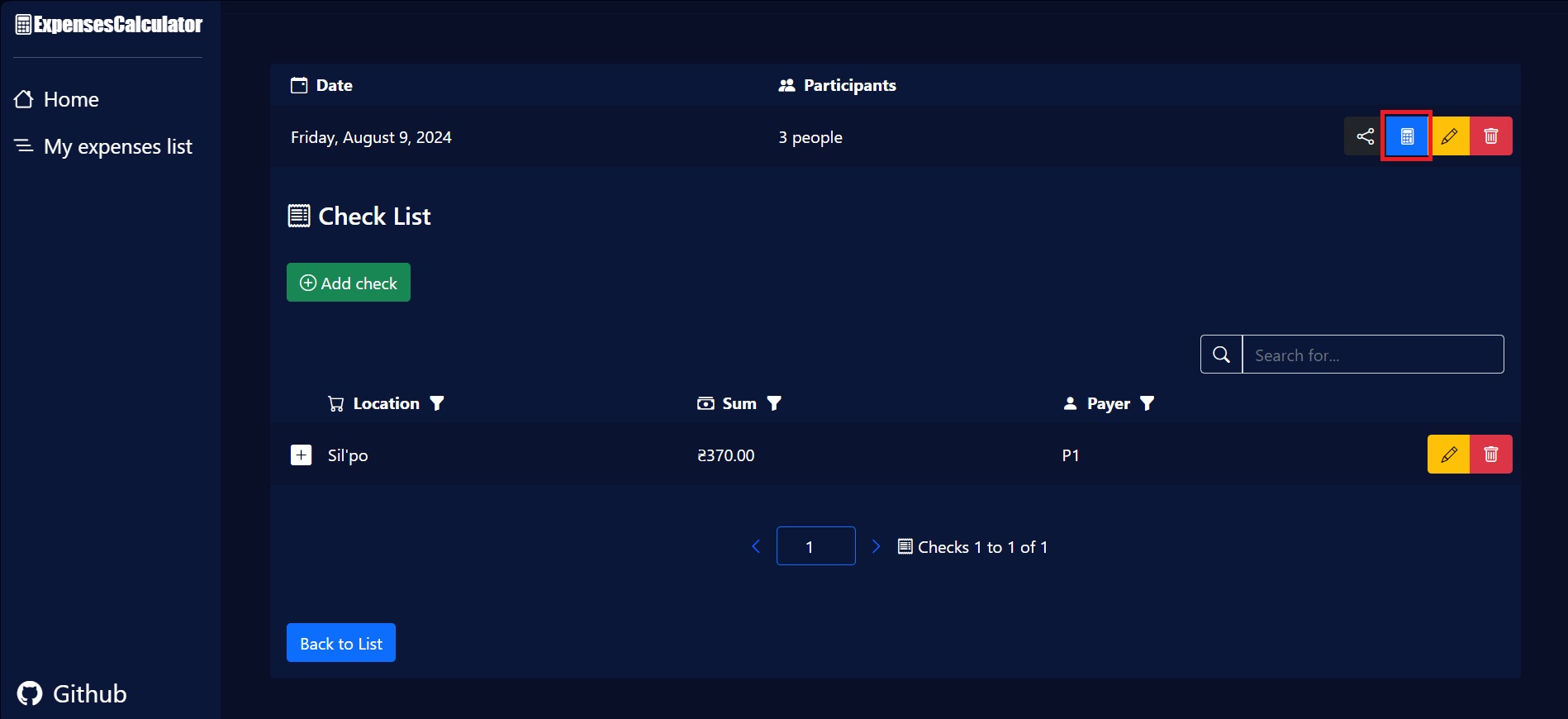 7. Click the button with a calculator image, to calculate the expenses between the participants.
