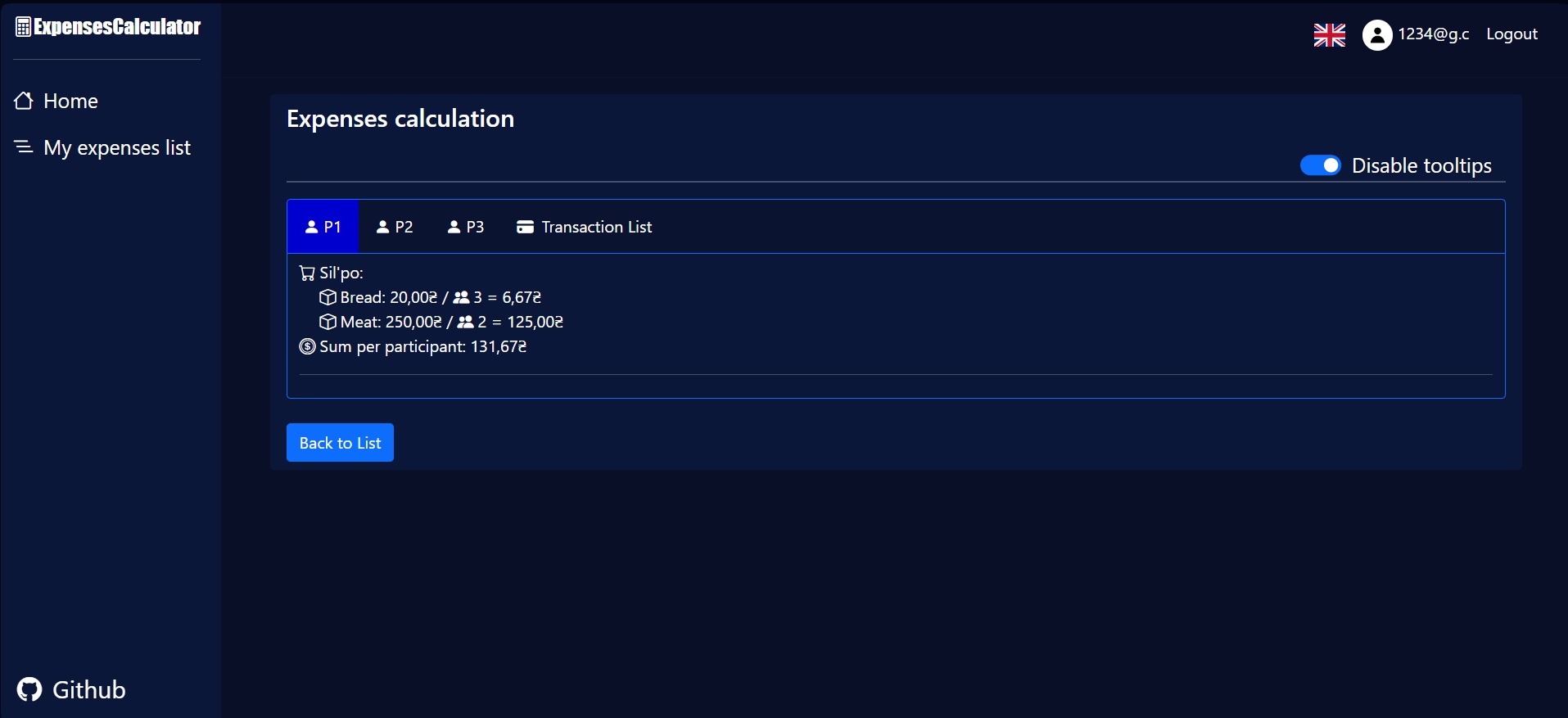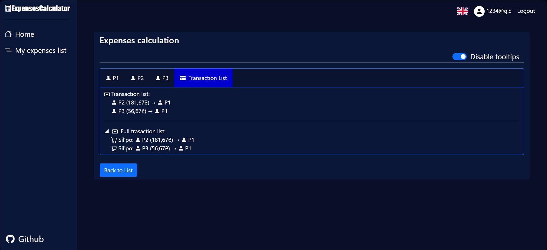 9. On the "Transaction list" tab you can see how much money each participant owes to the people who paid for the party.